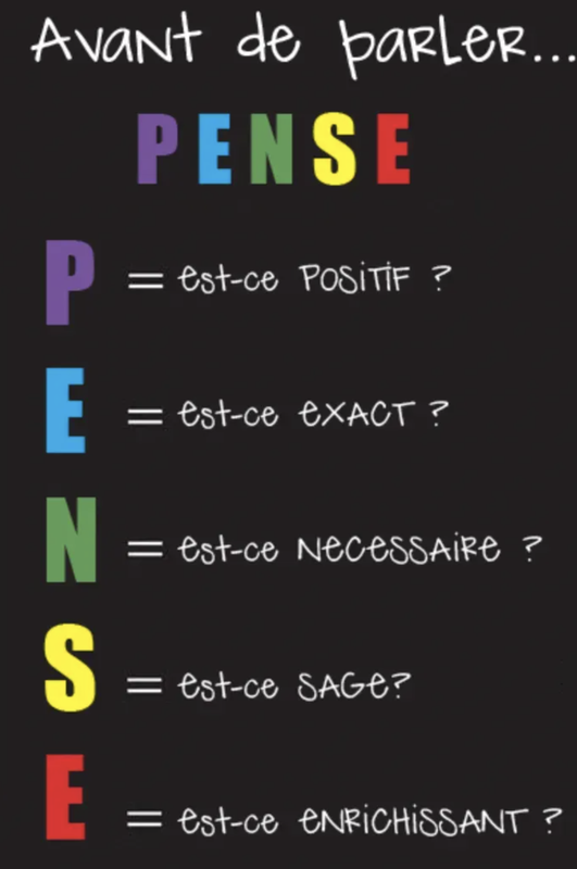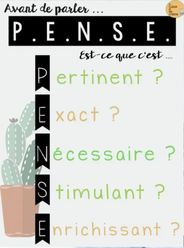 + Poster à faire moi et phrase à répéter souvent en classe, slogan de ma classe pour les élèves : "Si ce n'est pas nécessaire, mieux vaut se taire." (marche pour le harcèlement mais aussi pour tous les petits commentaires inutiles qui fusent parfois en classe).